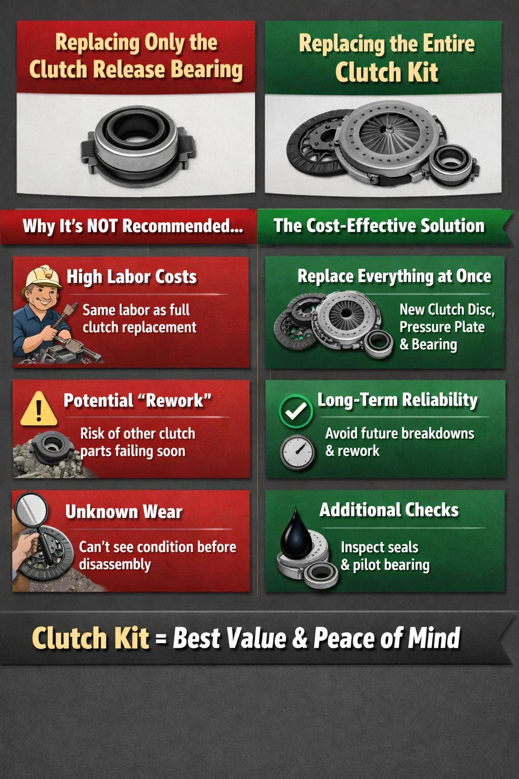 The lifespan of the parts in the clutch system (pressure plate, clutch disc, release bearing) is usually similar. If you only replace the bearing this time, and the clutch disc wears out and slips a few months later, you'll have to pay the high labor costs again to have the transmission removed, which is very uneconomical in the long run.