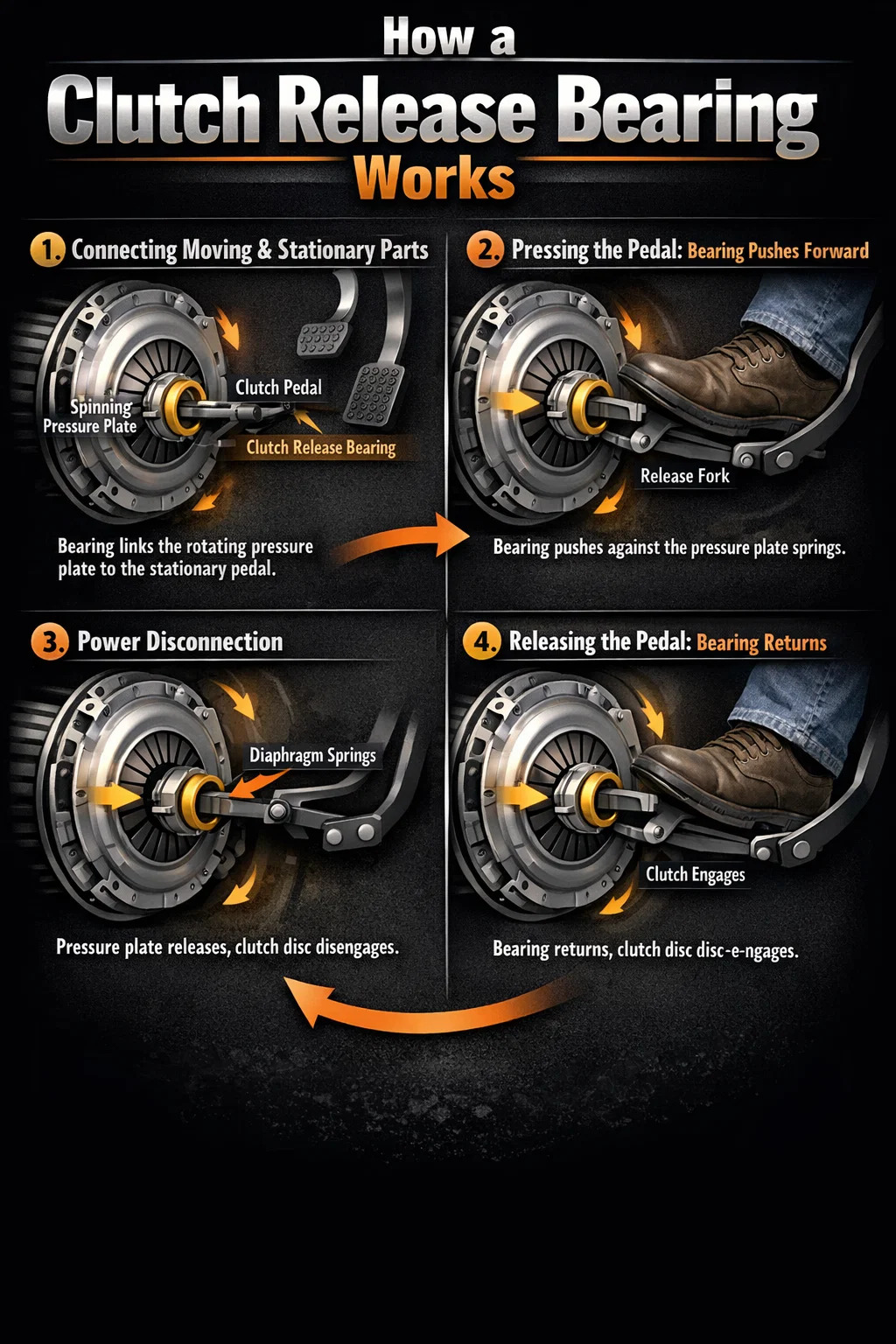 The clutch release bearing is a moving joint responsible for "transmitting pressure." Its working principle can be broken down into the following simple steps: