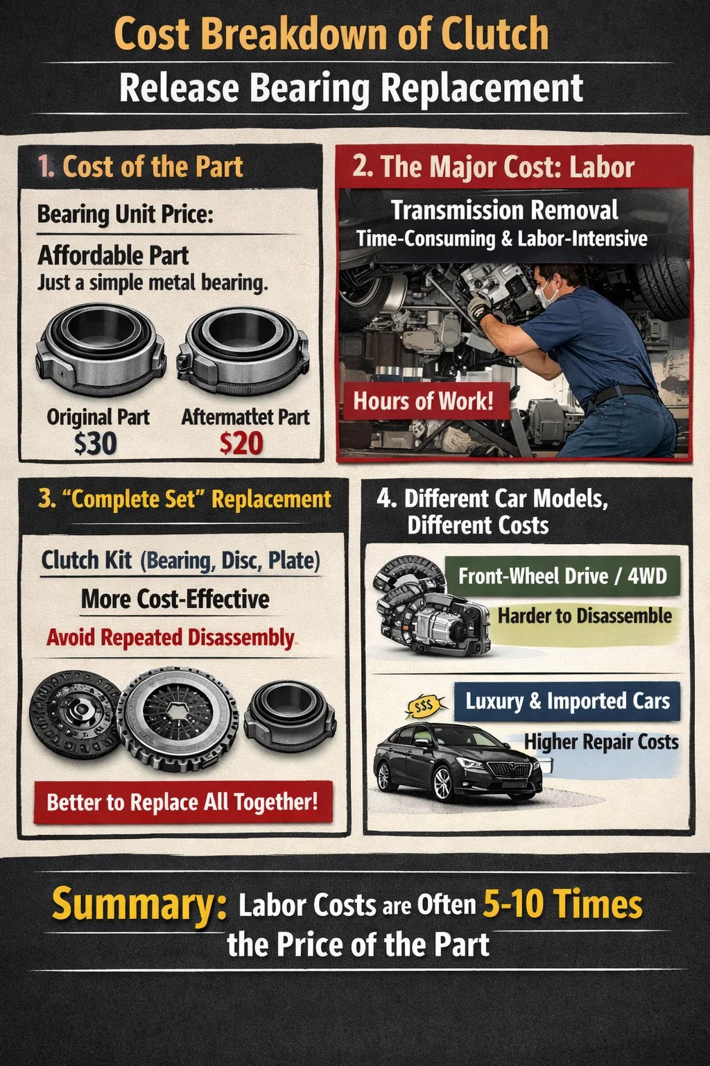 The cost of replacing a clutch release bearing (also commonly called a release bearing or thrust bearing) mainly consists of two parts, but the most painful part is often not the cost of the part itself, but the expensive labor costs.