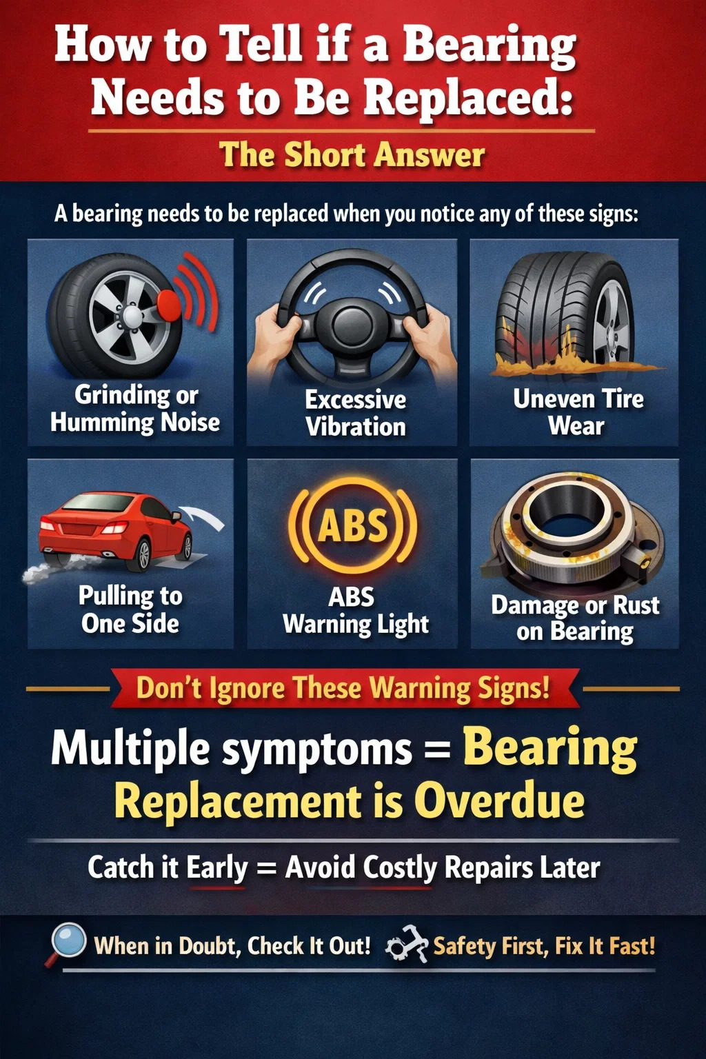 A bearing needs to be replaced when you notice one or more of the following: persistent grinding, humming, or growling noises that change with speed, unusual vibrations through the steering wheel or chassis, uneven or accelerated tire wear, the vehicle pulling to one side under braking, or visible physical damage such as rust, pitting, or discoloration on the bearing surface. In automotive contexts, an illuminated ABS warning light can also point directly to a failing wheel bearing. Any single symptom deserves investigation; multiple symptoms appearing together almost always mean replacement is overdue.
