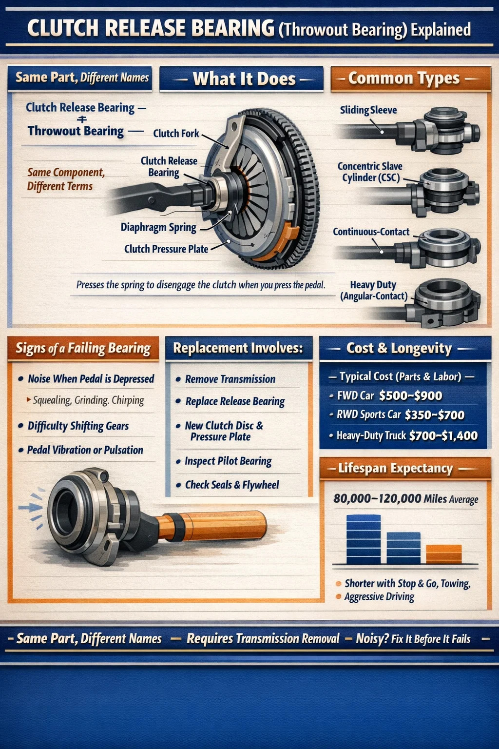 The practical advice is: do not ignore the noise. If you hear a grinding or squealing sound that is specifically tied to clutch pedal depression, schedule the repair before the situation becomes an emergency. Driving 2,000 to 3,000 additional miles on a noisy but still-functional bearing is a different proposition than driving 15,000 miles hoping the problem resolves itself.