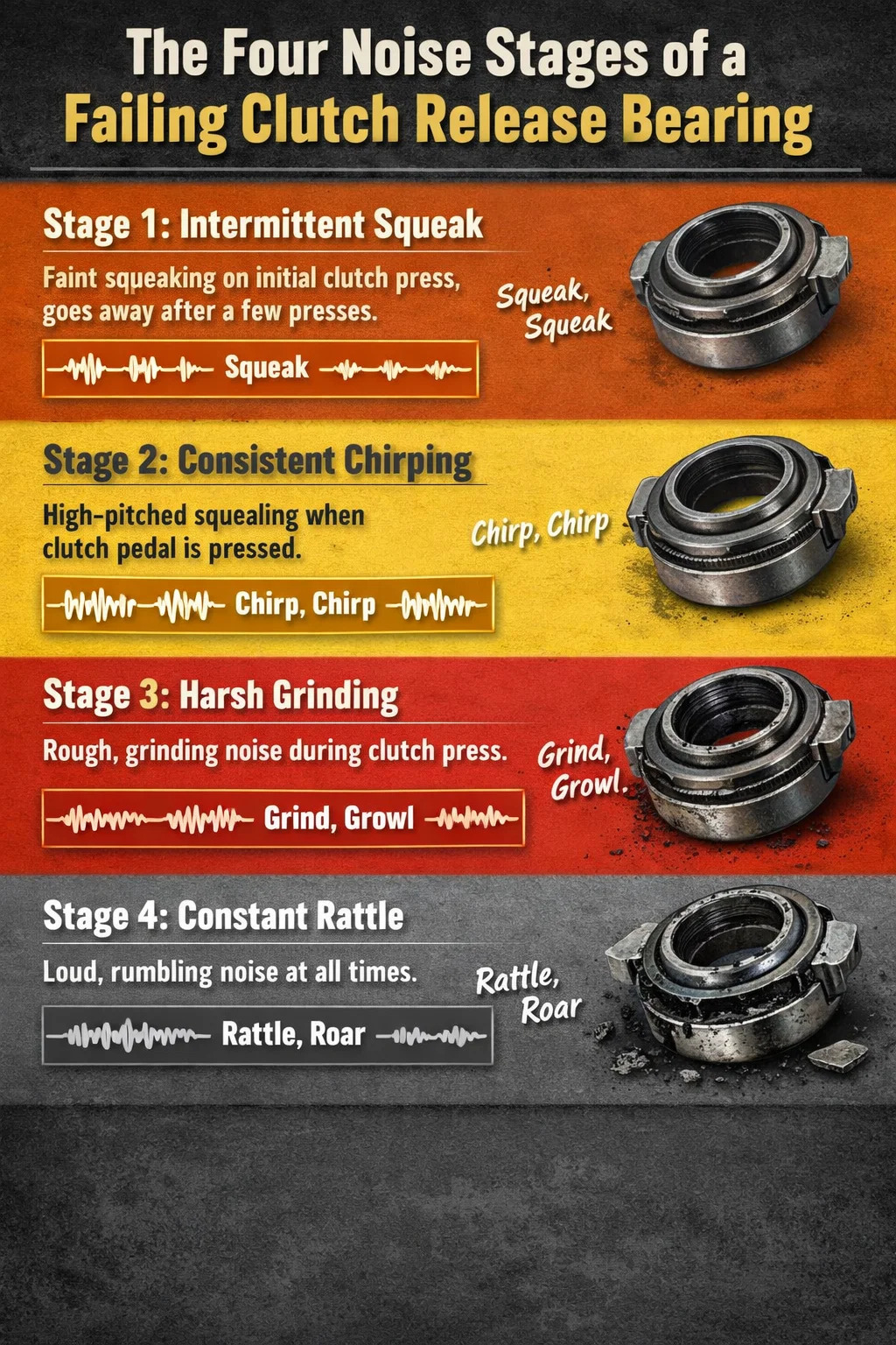 A worn clutch release bearing — also called a throw-out bearing — most commonly produces a high-pitched squealing, chirping, or grinding noise that appears specifically when you press the clutch pedal and disappears when you release it. This on-off relationship with pedal movement is the clearest diagnostic clue separating a bad release bearing from other drivetrain noises. In some cases the sound shifts to a harsh, metallic grinding when the bearing has progressed beyond squealing into physical contact between metal components. If you hear a consistent growl or rumble that changes character the moment your foot touches the clutch pedal, a failing clutch release bearing is the most probable cause.